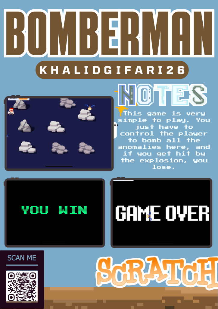 Okay, so this is a game I made in Scratch called Bomber Man. This game is very, very easy to play. You just have to control the player to avoid the anomalies here. If you manage to kill the anomaly by pressing the space bar, you win, but if you get caught by the anomaly, you lose. I made this game in about two and a half hours. Okay, that’s all for the explanation. and enjoy playing the game!